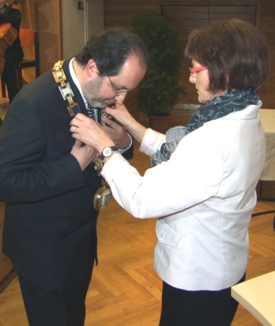 Als sichtbares Zeichen der Würde darf ich Ihnen nun die Amtskette umlegen. Die vielen Glieder dieser Kette, die zu einem Ganzen zusammengefügt sind, weisen auf die vielen Gruppen der Menschen in Oberkochen hin. Sie sind sowohl das Symbol für Einzigartigkeit als auch für Gemeinsamkeit. Ich bitte Sie, diese Kette wie in den zurückliegenden Jahren auch weiterhin mit Würde zu tragen.