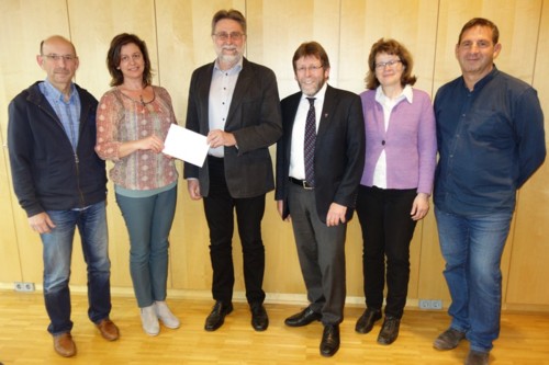 Bei der Geldübergabe von links nach rechts: Robby Ness, Frau Graef (zuständig für Finanzen), Richard Burger, Pfarrer Marstaller, Vikarin Schaaf-Bosch, Thomas Böttcher.