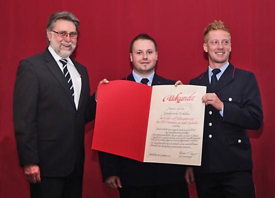 Ich danke für eure, für Ihre Aufmerksamkeit und darf den Jugendwart Stefan Leopold, den stellvertretenden Jugendwart Christian Keil, zur Überreichung dieser Urkunde und natürlich des Umschlags mit Inhalt auf die Bühne bitten.